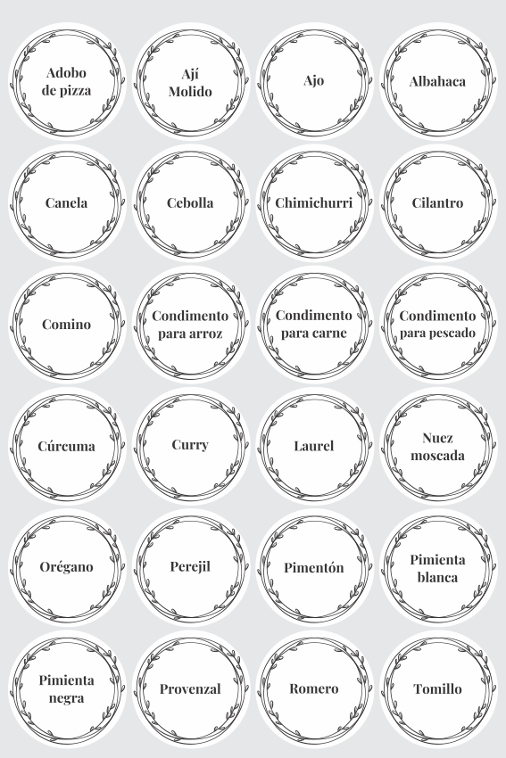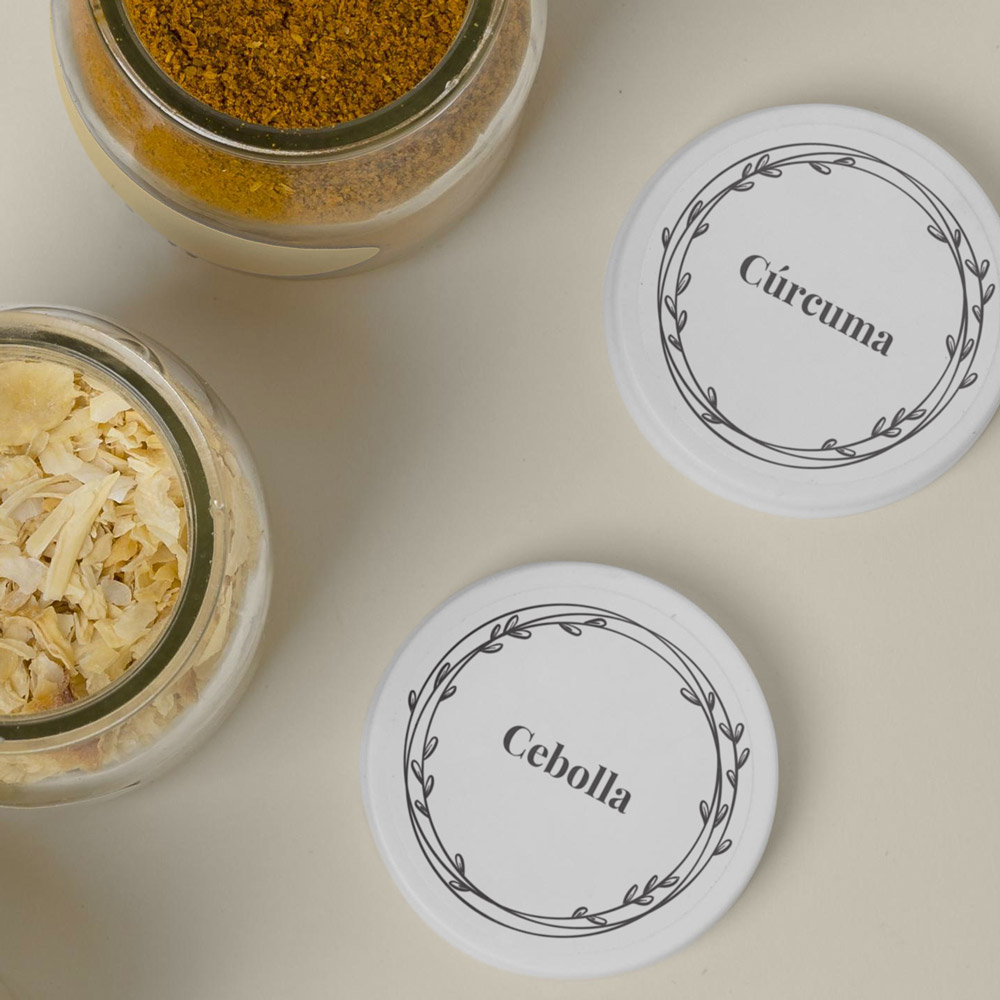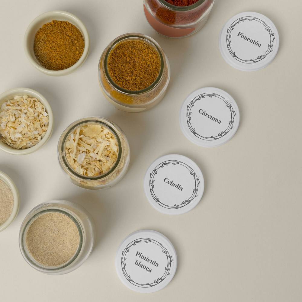 Cantidad: Etiquetas de vinilo autoadhesivo x 24 unidades de especias surtidas de 4,7 cm de diámetro.